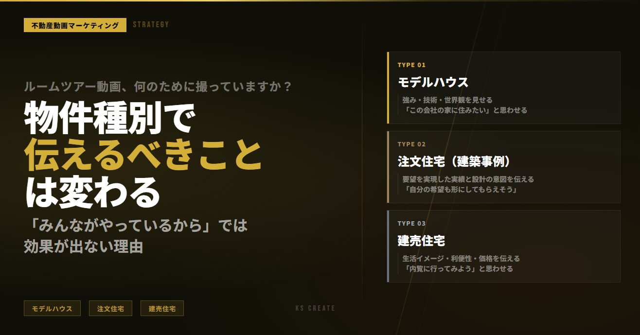 ルームツアー動画を効果的にするには、物件の種類によって「何を伝えるか」を変える必要があります。